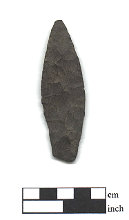 Description: a lanceolate point with a long and slender form, convex blade edges taper to the point and the base which is often straight; often displays parallel flaking and the basal edges are usually ground