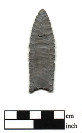 Description: a slender lanceolate fluted spear point with delicate ears and a fishtailed base; fluting tends to extend nearly the entire length of the point; a diagnostic trait is the "waisting", or incurvate blade edges of the hafting area