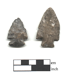 Description: broad, thick, corner-notched points of medium size; blade edges slightly excurvate; prominent barbs and expanded base, usually ground smooth