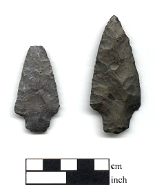 Description: large, thick , straight stemmed points of medium breadth; biconvex in cross section; straight lightly ground base