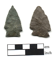 Description: generally broad and thin points of medium size; corner notched on a short, wide stem that is ground smooth at the base; triangular blade with straight to slightly excurvate edges